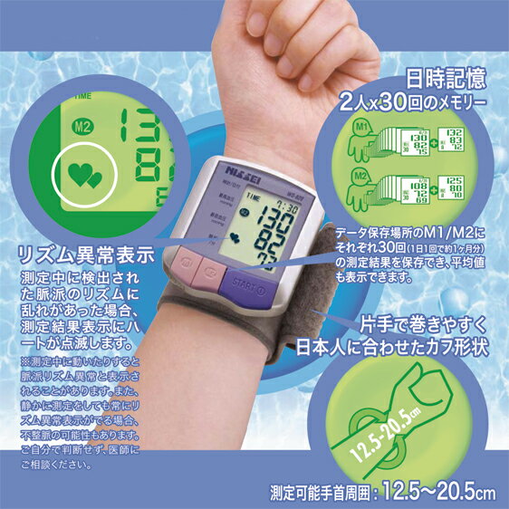 ■商品番号■60052 手首式デジタル血圧計 (日本精密測器)WSー820 サイズ 縦71.5×横64.0×厚み31.5mm(カフ部を除く) ●重さ:約107g(電池を含まない) 材質 本体:ABS樹脂 ●カフ:ナイロン 仕様 測定方法:オシロメトリック法 ●表示:12桁液晶表示 ●圧力表示範囲:0〜300mmHg(カフ圧力) ●測定範囲:50〜250mmHg(最高血圧)、40〜180mmHg(最低血圧)、40〜160拍/分(脈拍) ●精度:±3mmHg(圧力)、±5%(脈拍) ●臨床性能試験による血圧測定の誤差【聴診に対する平均誤差】±5mmHg以内、【標準偏差】8mmHg以内 ●カフ内圧力表示の誤差:±3mmHg以内 ●急速排気:260mmHgから15mmHgへの急速排気時間は10秒以下 ●カフ内圧力表示の安定性:10000サイクル模擬測定後カフ内圧力の表示値の変化は±3mmHg以内 ●加圧:自動(エアーポンプ) ●減圧:自動(電子制御弁) ●排気:自動急速排気弁 ●電源:単4アルカリ電池2本 ●電気的定格:定格電圧/DC3V、定格消費電力/2W ●メモリー:2つのメモリーにそれぞれ30回分の測定結果とその平均値 ●初期加圧:190mmHg(固定) ●使用環境:+10〜+40℃ ●保管環境:-5〜+50℃ ●カフ:スプリングカフ ●測定可能手首周囲:約12.5〜20.5cm 付属品 取扱説明書、添付文書、キャリングバック、単4電池2本 医療機器 承認番号 21700BZZ00318000 生産国 日本 ●保証期間:1年家庭用血圧計というと、オムロンやテルモの名前をよく耳にしますが医療現場でよく使われているのは血圧計専門メーカー日本精密測器の血圧計です。
